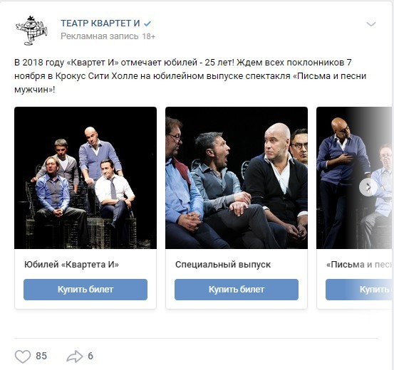 В Facebook/Instagram запустили кампанию по всей Москве по интересам, связанным с концертами и комедийными фильмами, а также по похожей аудитории. Так как целевая аудитория «Квартета И» люди среднего возраста, показ рекламы мы настроили для пользователей, старше 30 лет. В качестве креатива использовали формат рекламы «Карусель» .