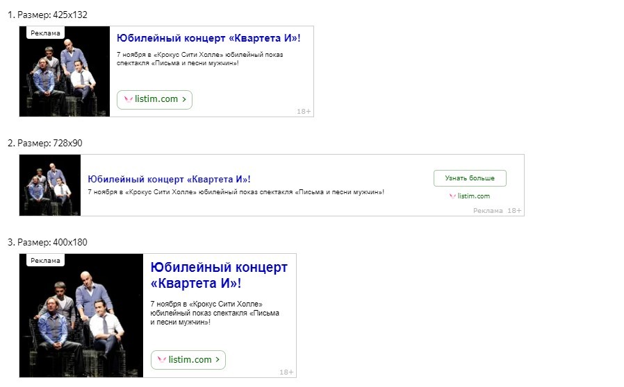 В РСЯ собрали основную семантику по бренду, названию концерта, фильмам и актерам Квартета-И, а также использовали кастомную аудиторию пользователей, которые были в театре хотя бы 1 раз за 3 месяца. Использовали все возможности создания объявлений для сетей. В том числе 2 варианта изображений – квадратное и широкоформатное – для попадания во всех места размещения Яндекса.