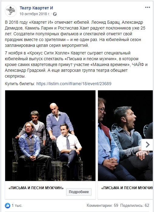Летом 2018 года к нам обратился клиент с целью продвижения юбилейного концерта в честь 25-летия «Квартета И» 7 ноября 2018 года в Крокус Сите Холле. Необходимо было увеличить продажи на концерт.